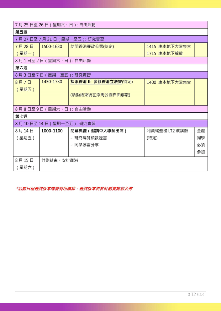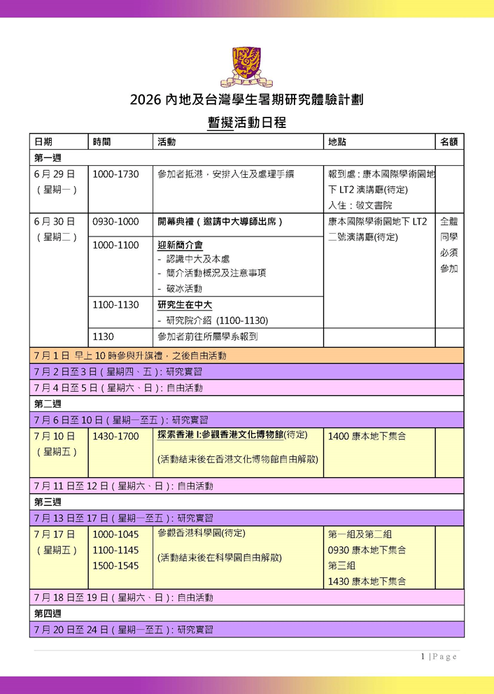 下滑至“其他信息”查看暂定日程,仅供参考,以抵港后港中大发布的版本为准。